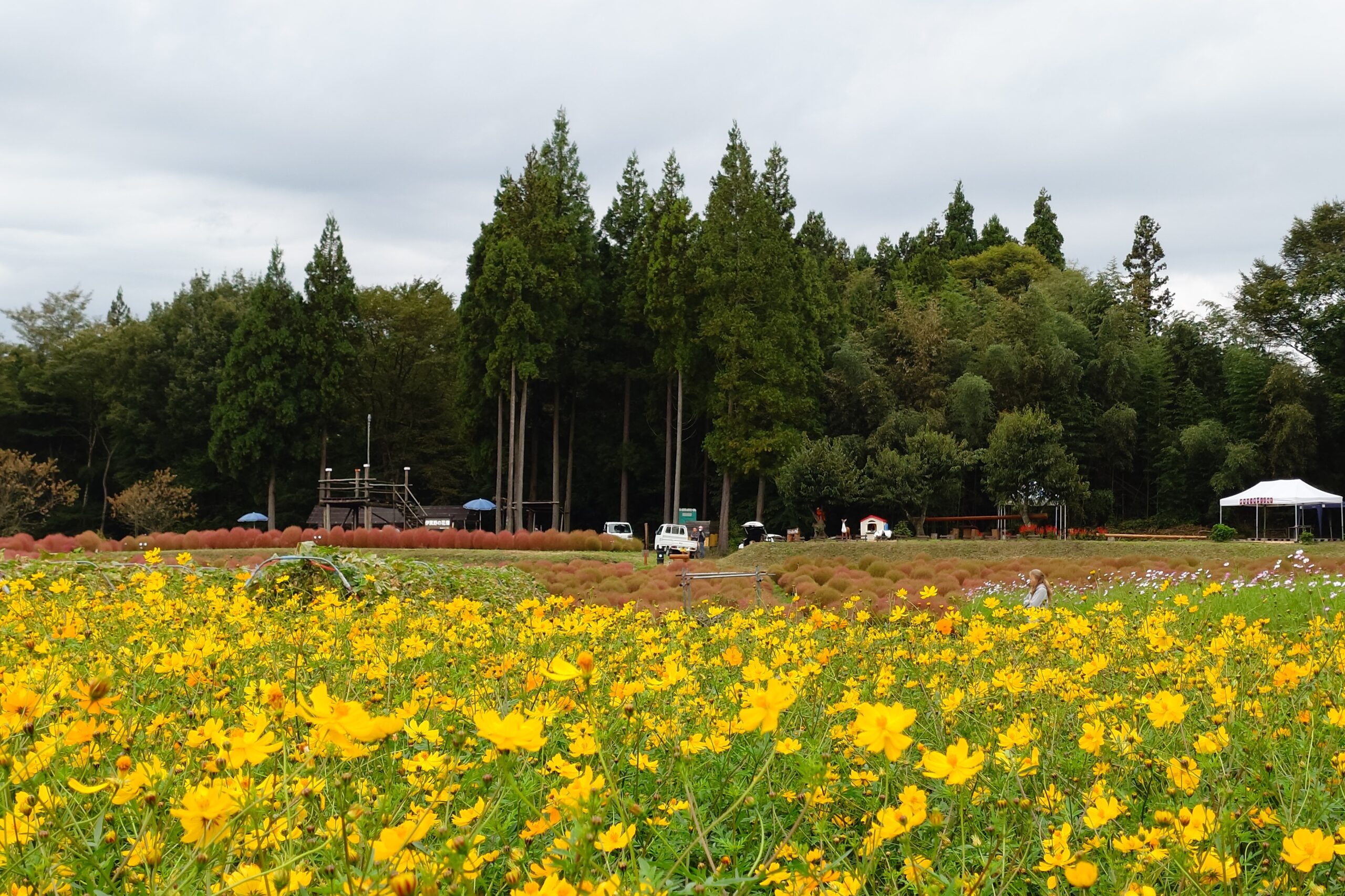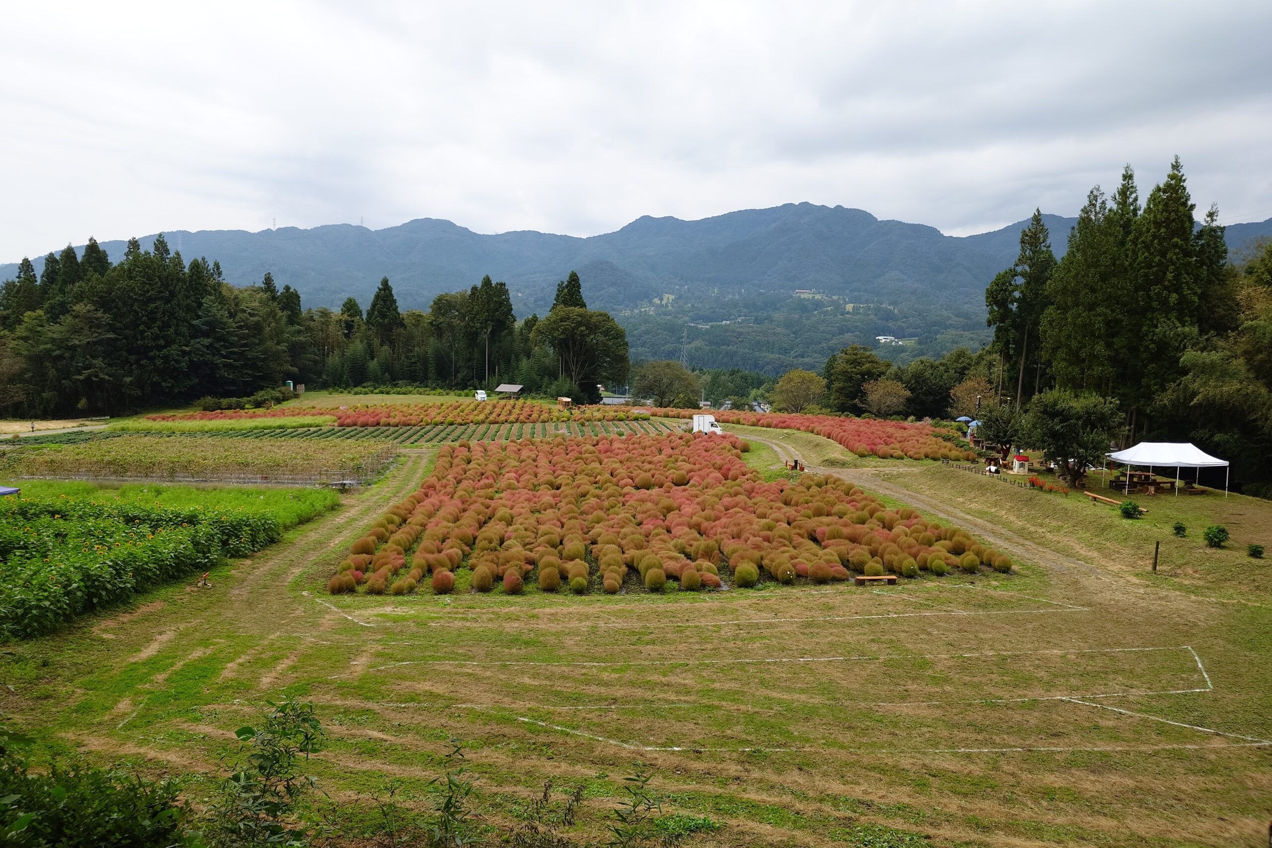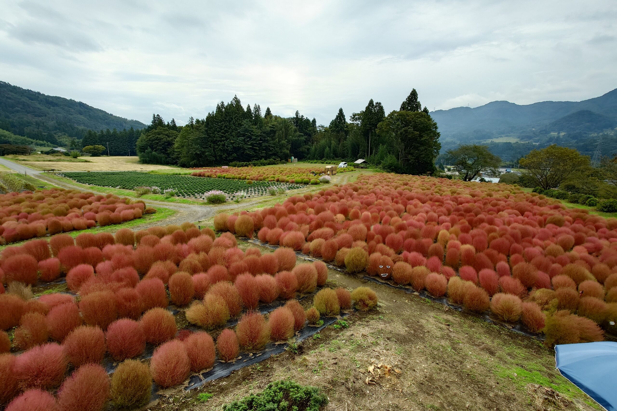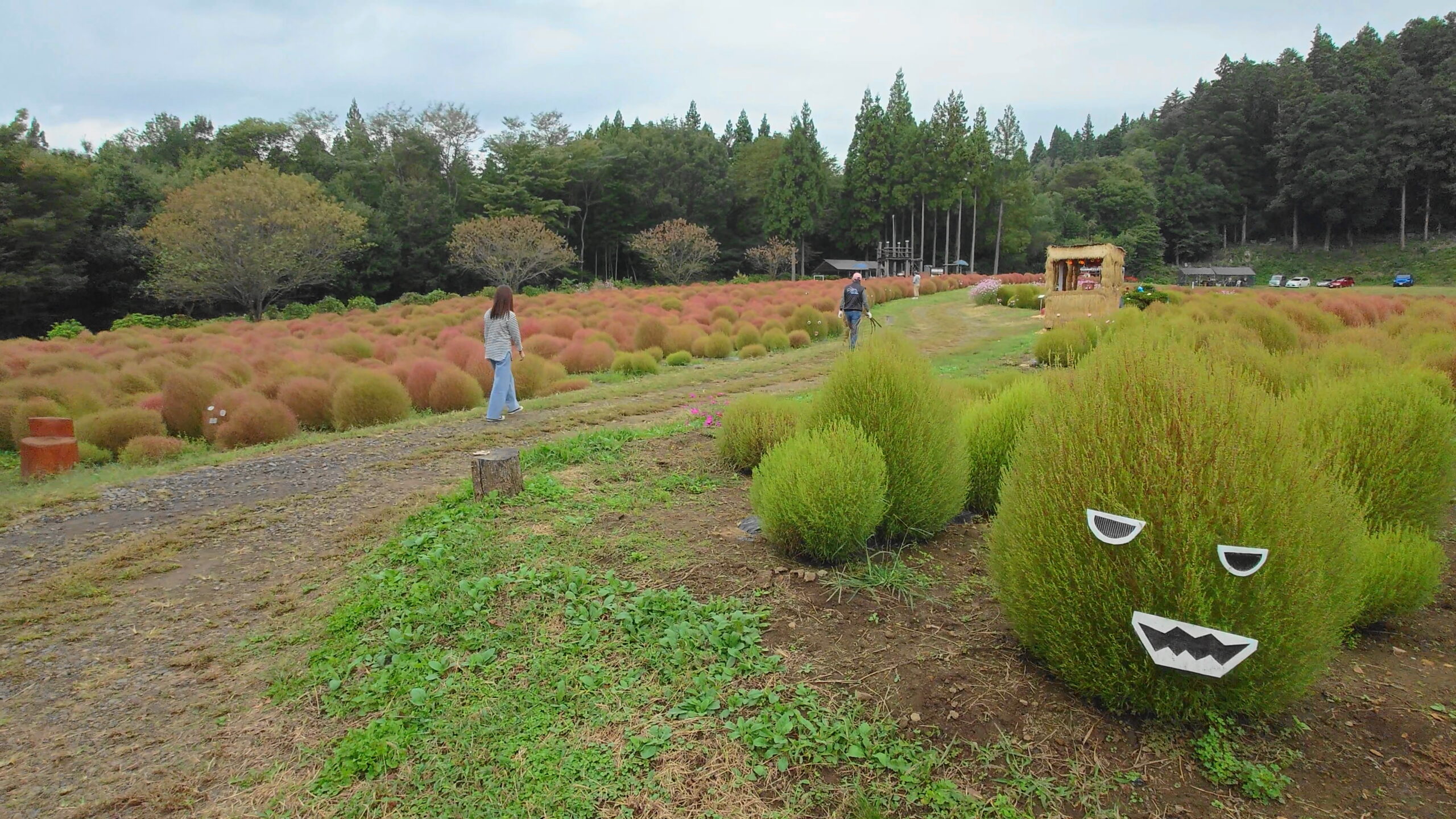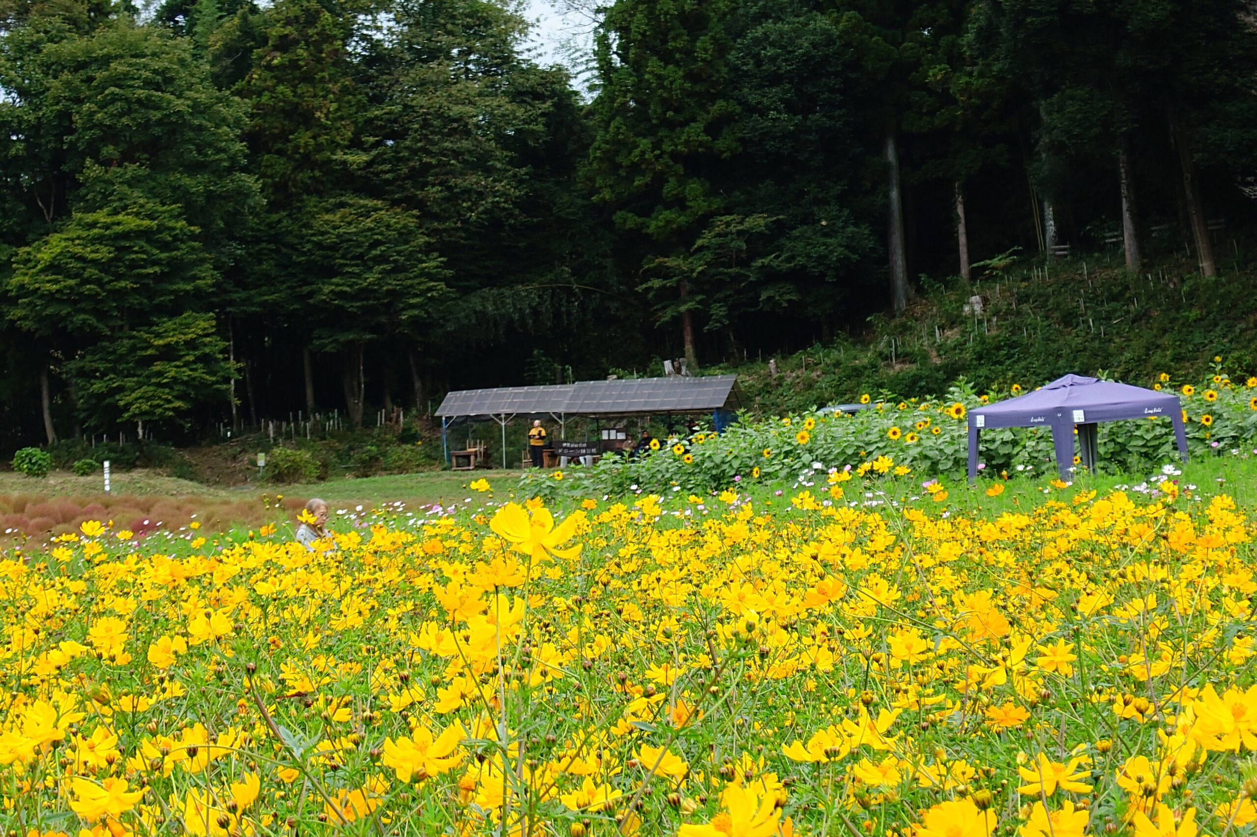 ほうき草(コキア)、コスモス、小菊、ヒマワリ、蕎麦などを