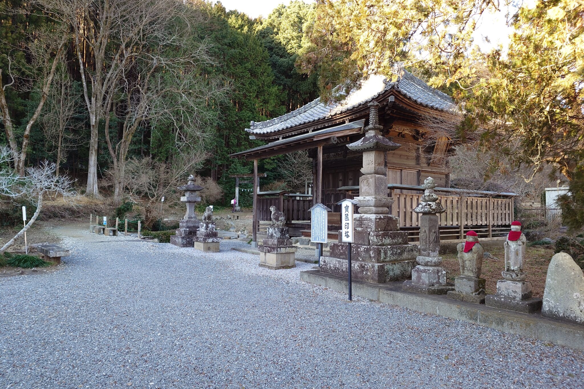 凍てついた池を右手に進んでくると軍太利神社が鎮座して