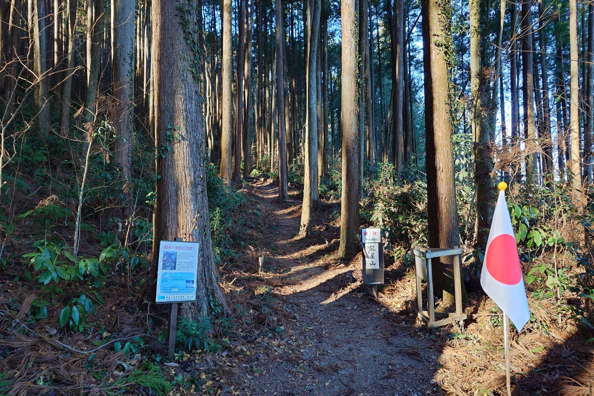 その先が龍崖山の登山口で祭日なので日の丸が有りました