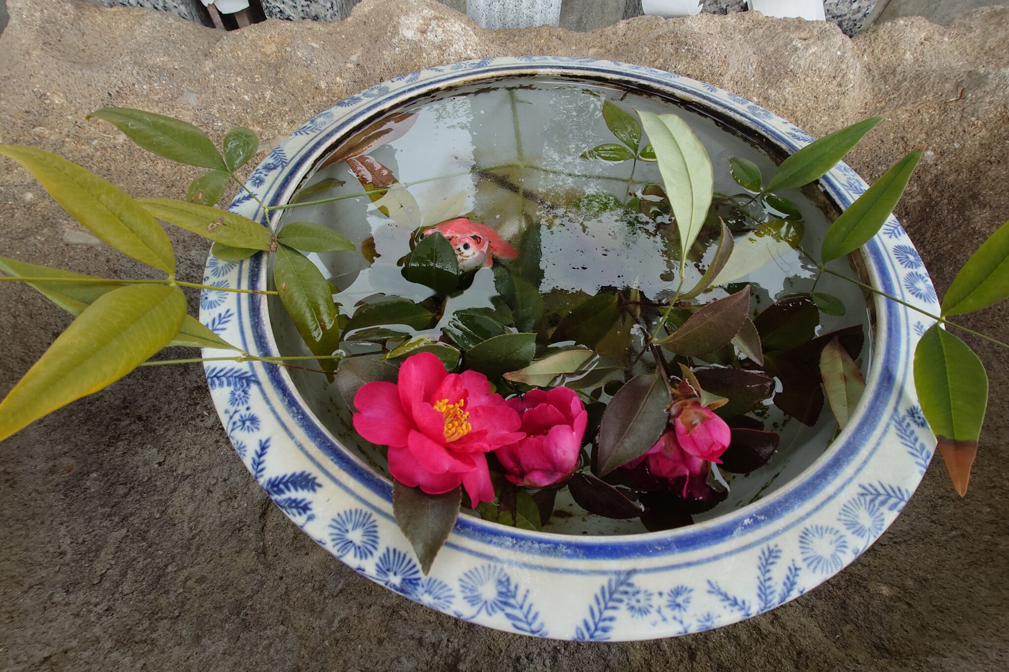 若干の薄氷の張る水鉢の中の金魚と椿の花