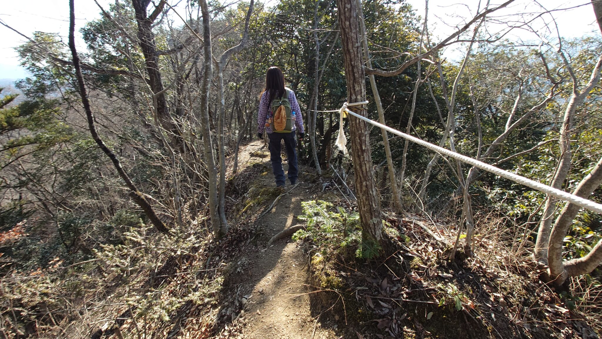 歩き出して直ぐの痩せ尾根にはロープ