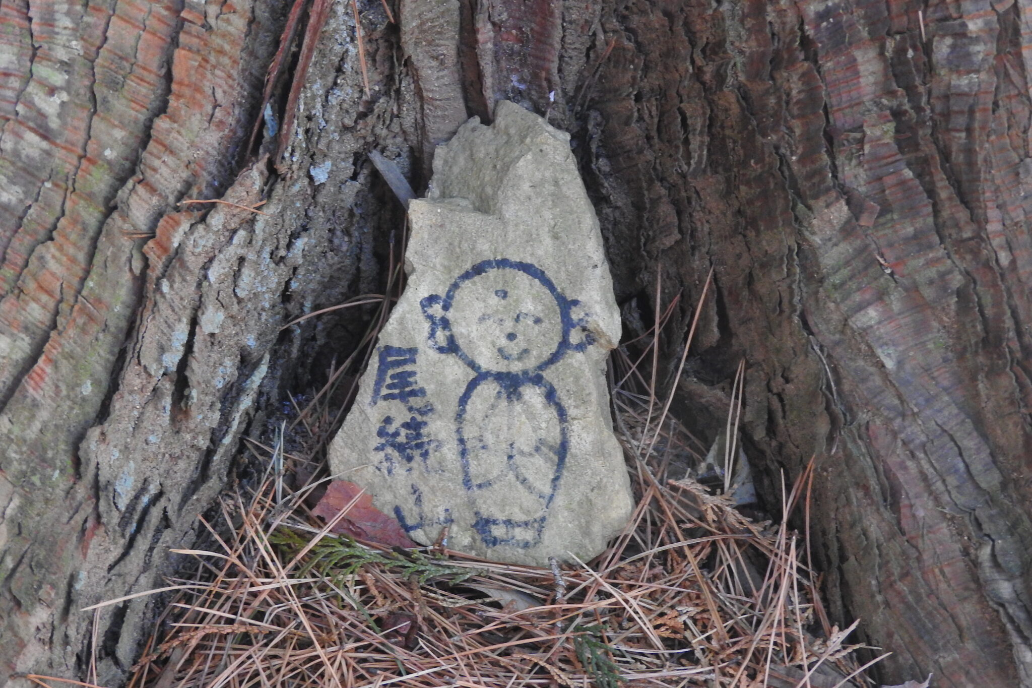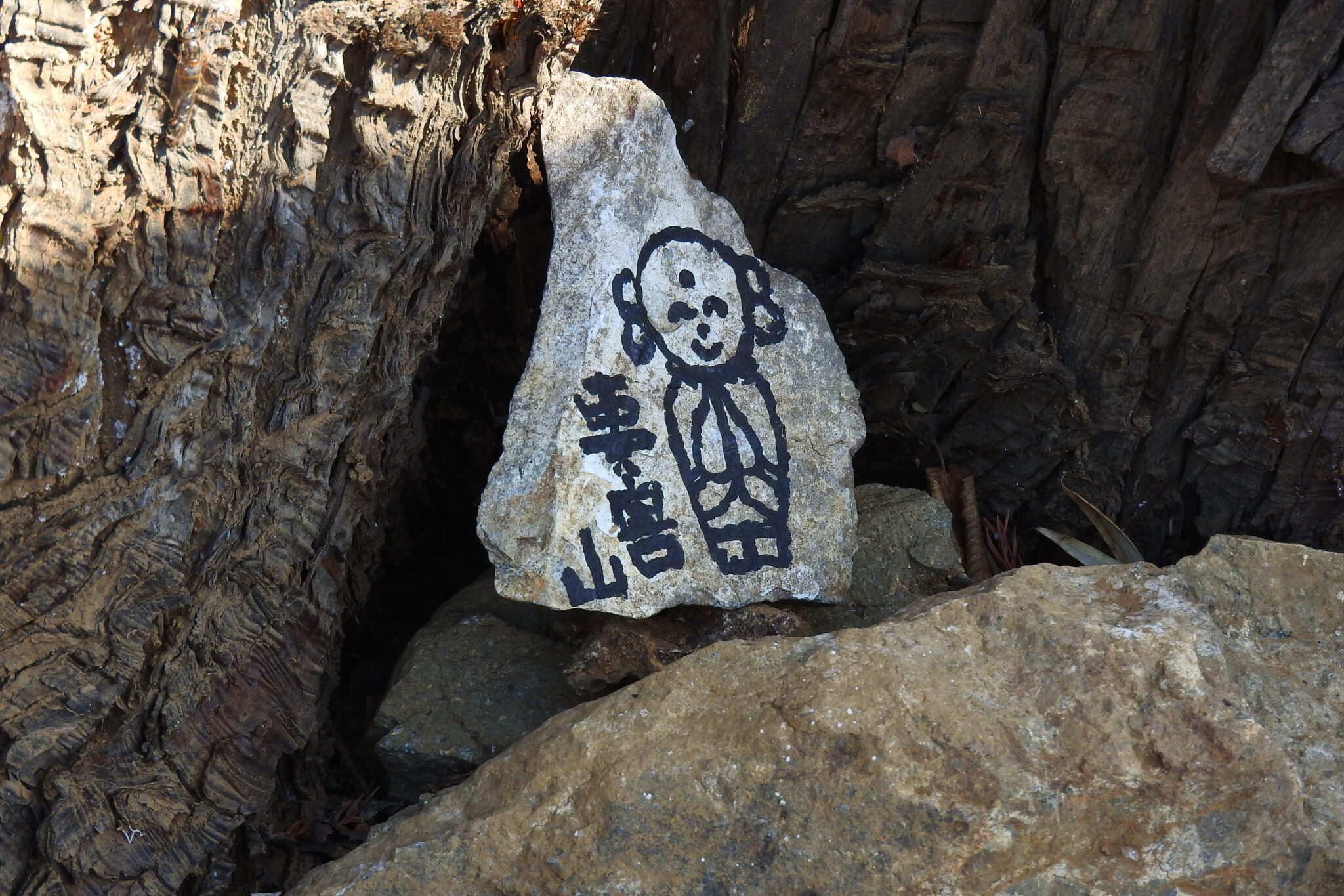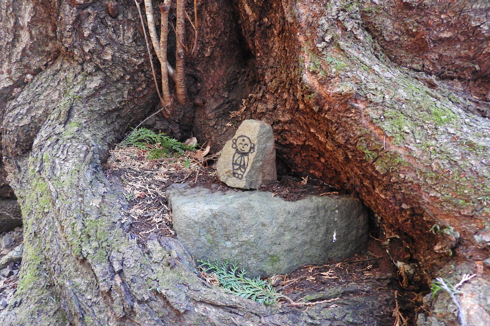 笑顔の尾続地蔵が木の根元に |