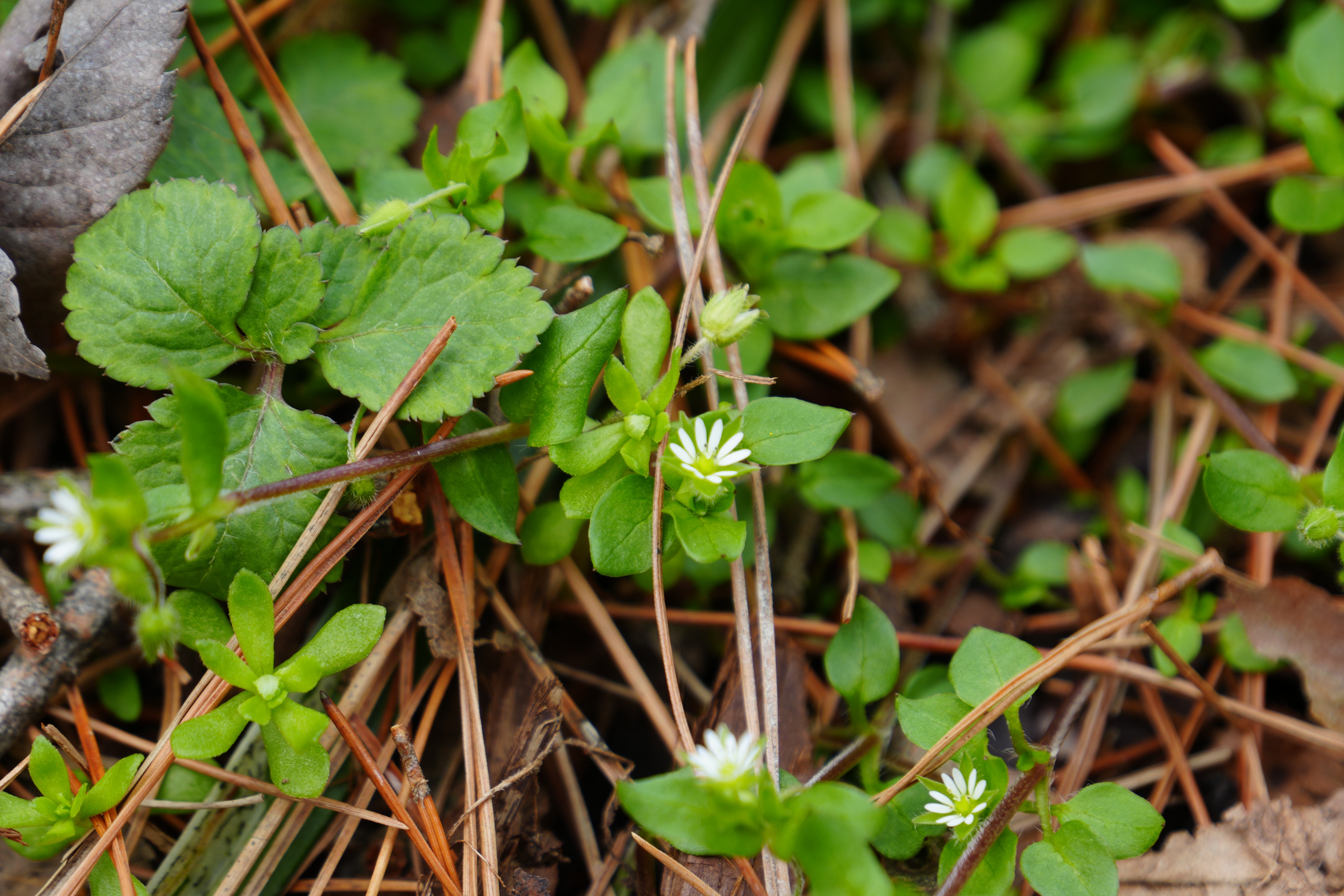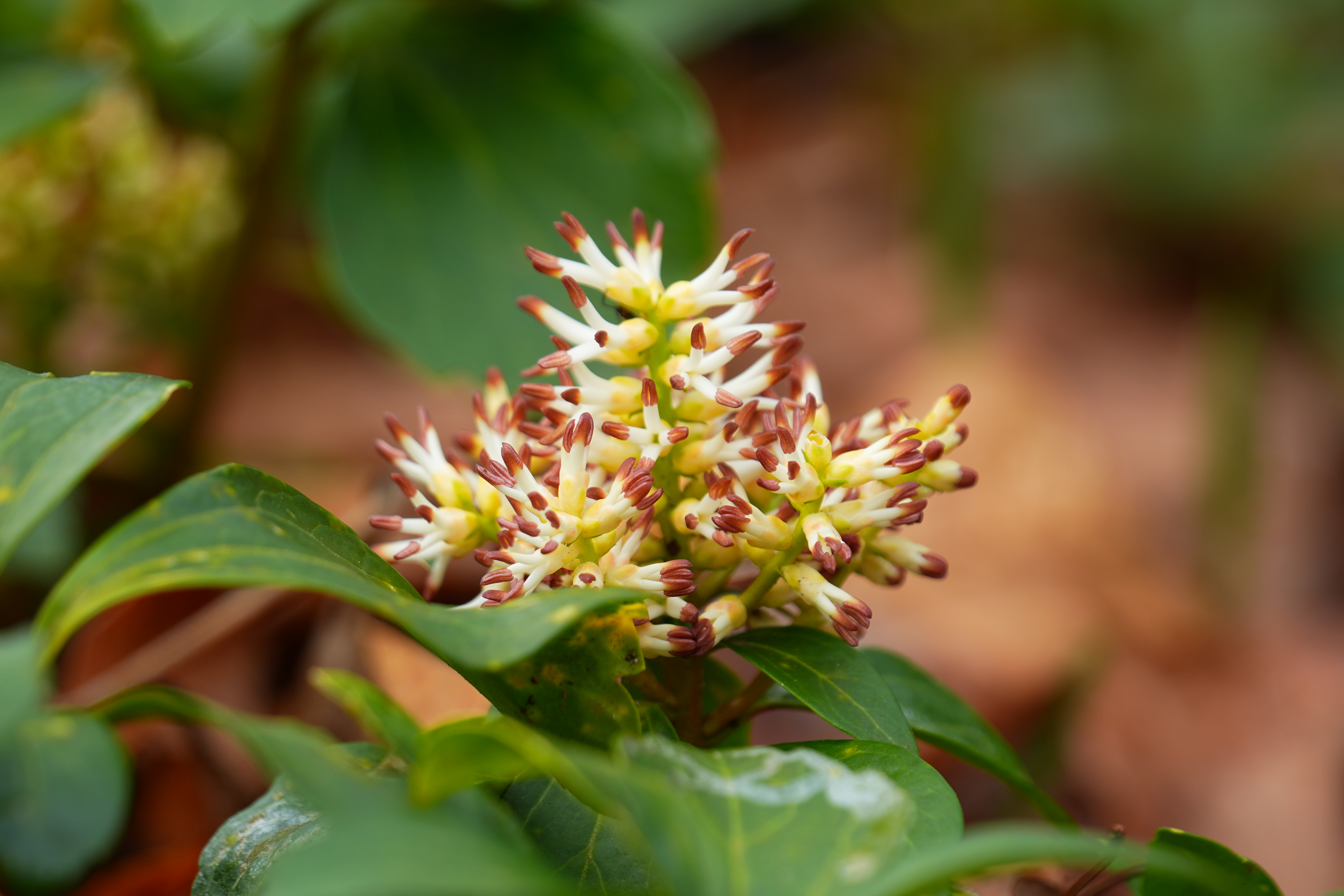 囲炉裏が無くなった休憩舎の近くでフッキソウ