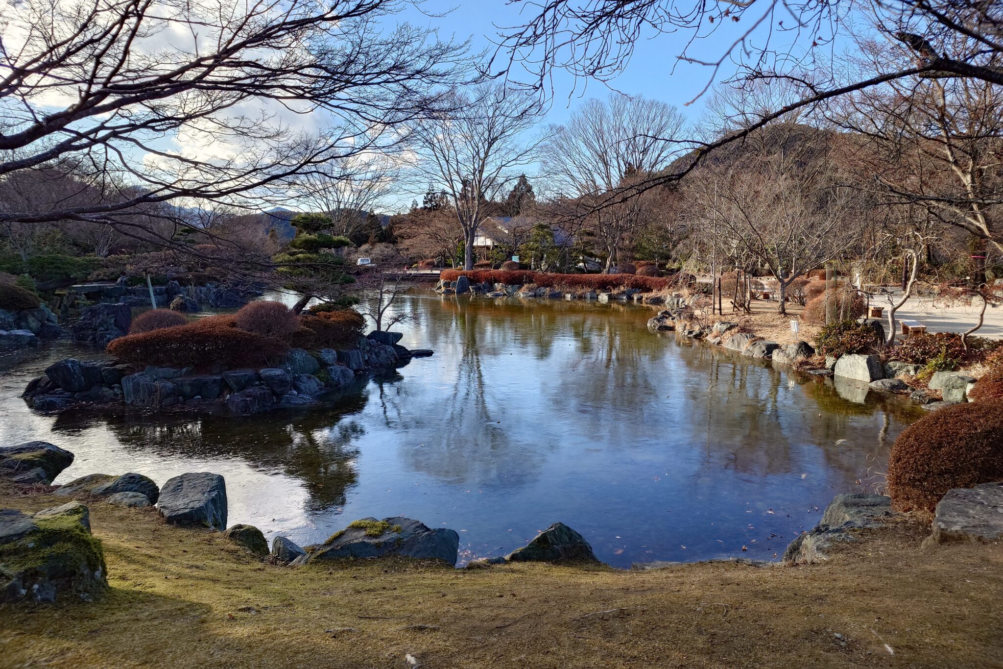 日本庭園の池には薄氷が張ってました