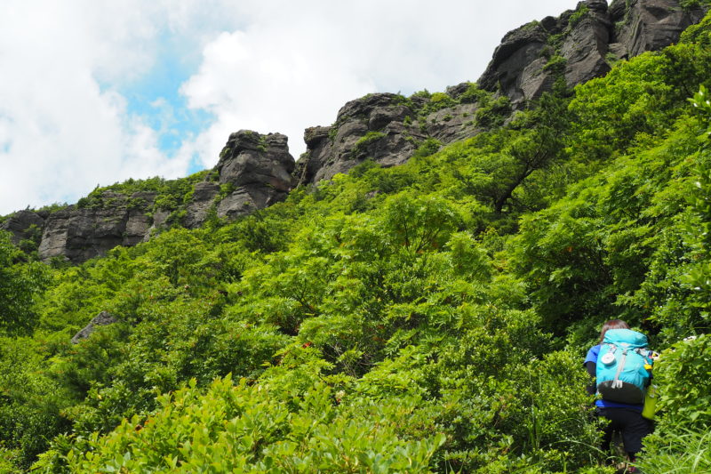 対岸の稜線には後で歩く鉄山避難小屋が小さく確認できます