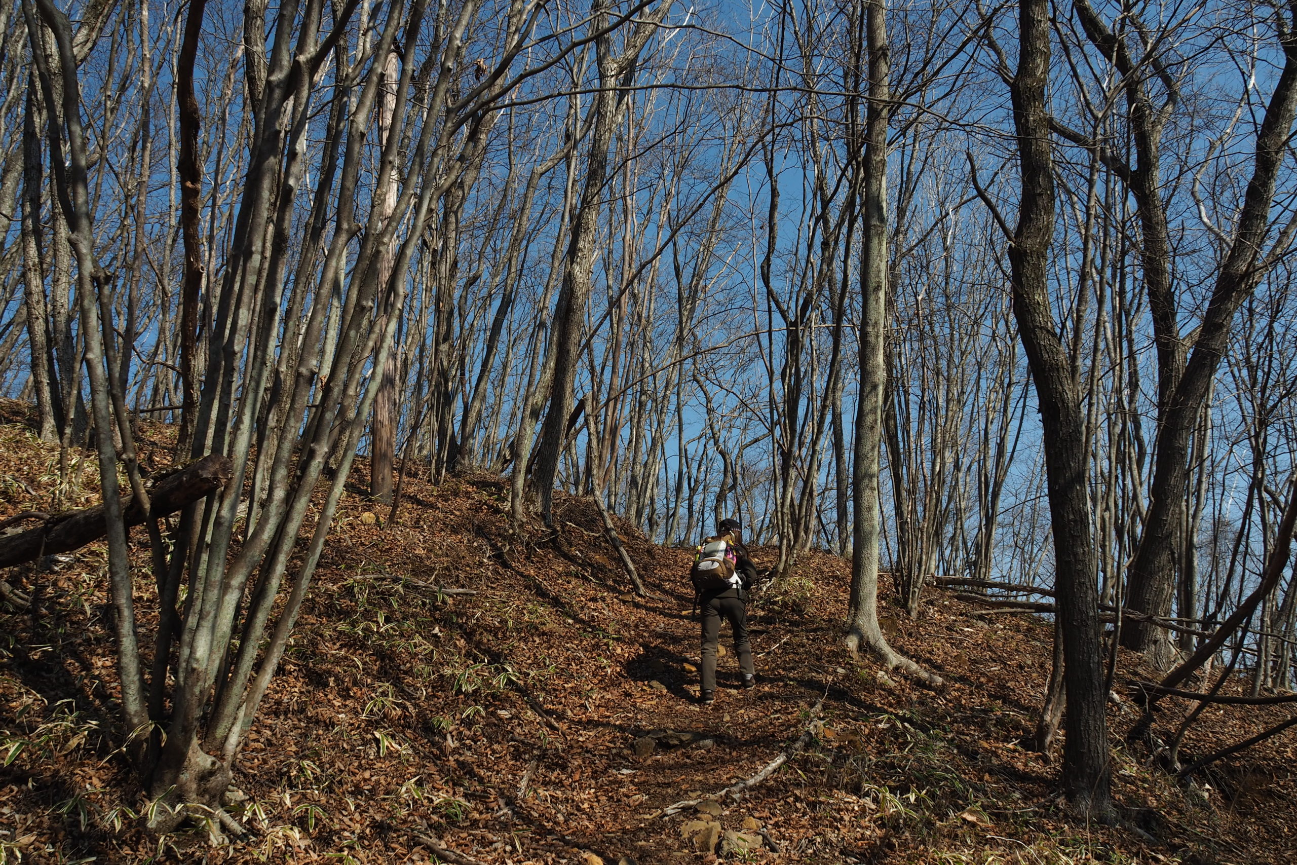 途中車道を横断して笹原の道は斜度を増してゆきます
